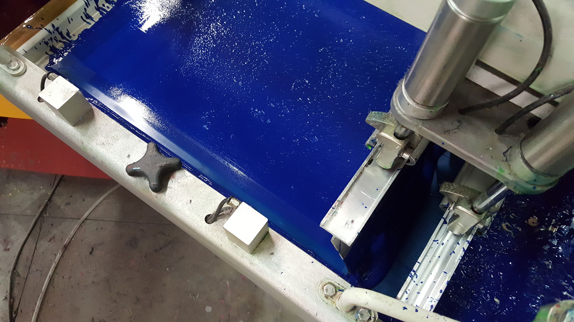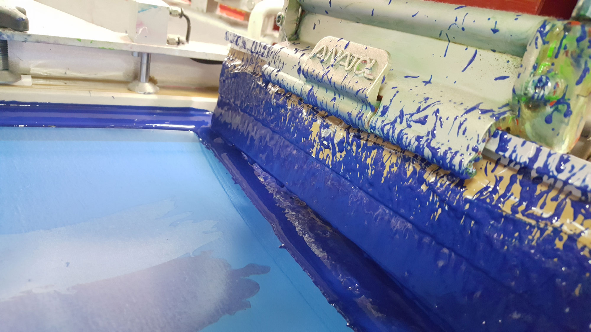Il passaggio o permeazione dell’inchiostro dalla parte superiore del quadro serigrafico alla superficie di stampa posta sotto, avviene tramite un passaggio con una leggera pressione di una barra dotata di un bordo in elastomero poliuretanico che si appoggia sull’inchiostro e preme quest’ultimo attraverso il tessuto da stampa tramite un movimento di scorrimento. Questa barra viene definita spremitore o Racla per serigrafia.